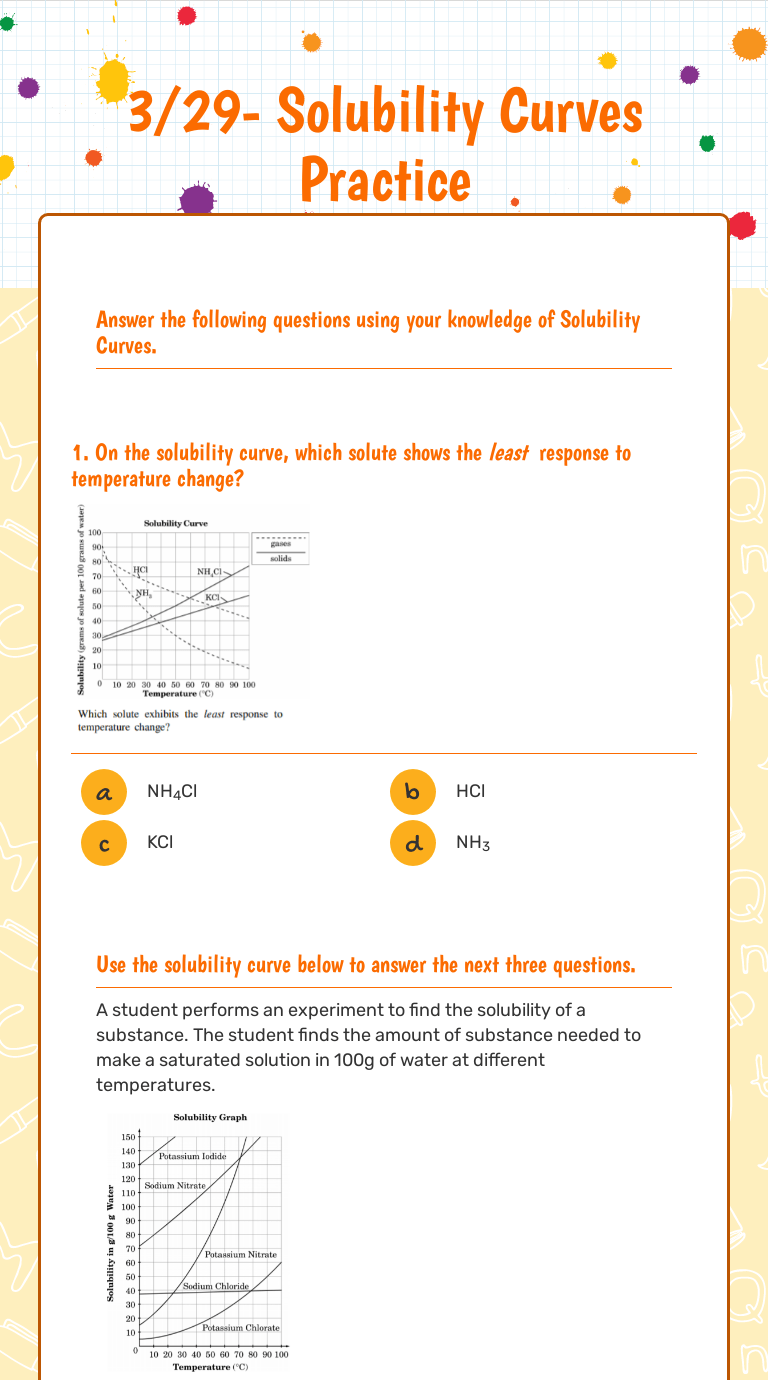 30 Trends For Worksheet Reading A Solubility Curve from ecdn.teacherspayteachers.com Use graph to determine mass of solute that dissolves in. Each solute has a different solubility at different temperatures and the change . Use your solubility curve graph provided to answer the following questions. What are the customary units of solubility on solubility curves? Values on the graph_below la curve represent . To display the different solubilities at different temperatures,. Answer the following questions using the solubility graph above. Use the solubility curve below to answer the next three questions.